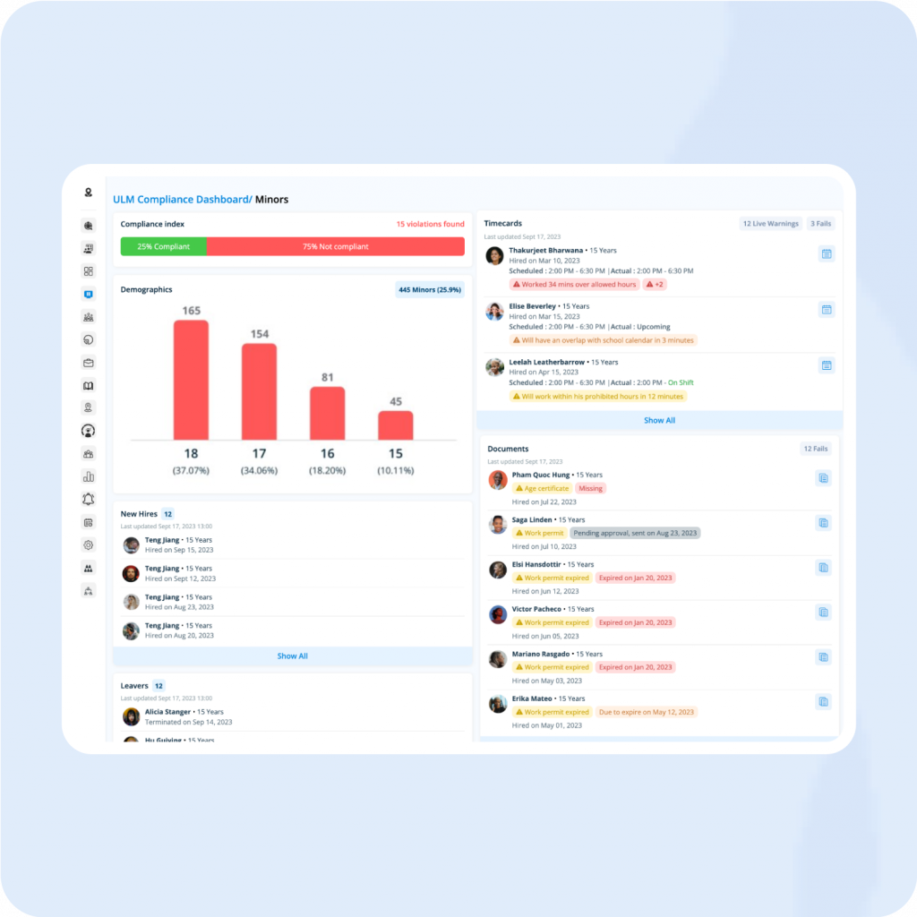 Embed minor rules, contracted hour limits, and rest between shifts compliance into your schedule creation automatically. Restrict publishing when violations exist and block employees from picking up shifts that would contravene working time regulations or violate contracted hours.